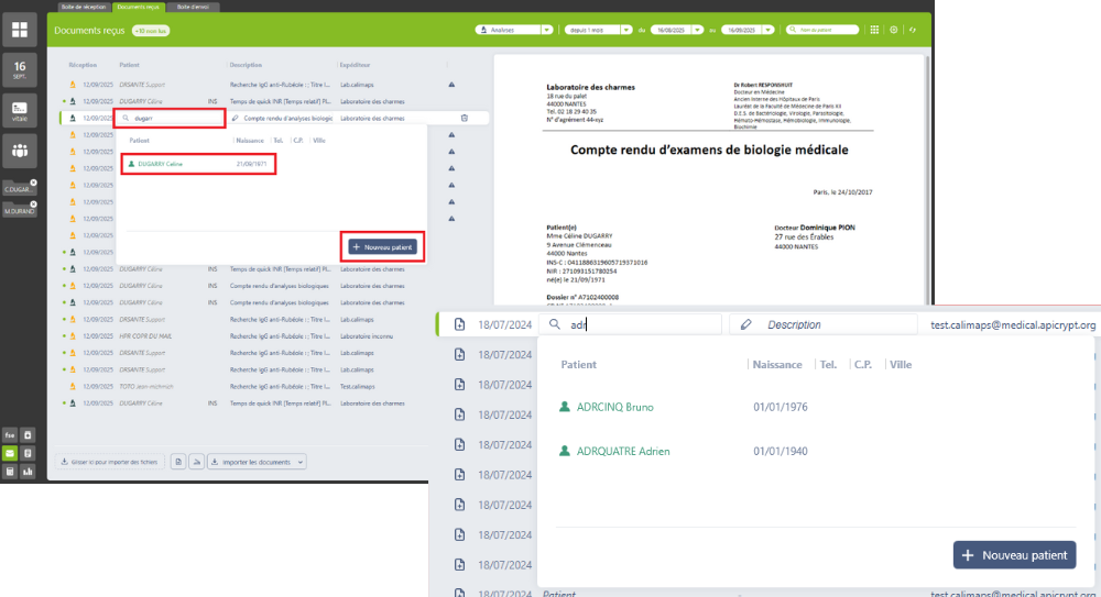 Si le dossier patient n’a pas été automatiquement identifié, cliquez sur « Patient » ou sur le nom extrait par l’OCR et saisissez le nom du patient. Vous avez alors deux situations possibles :