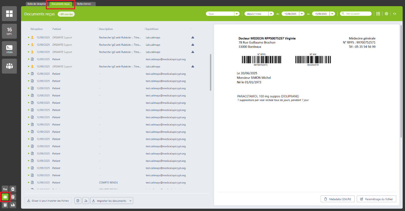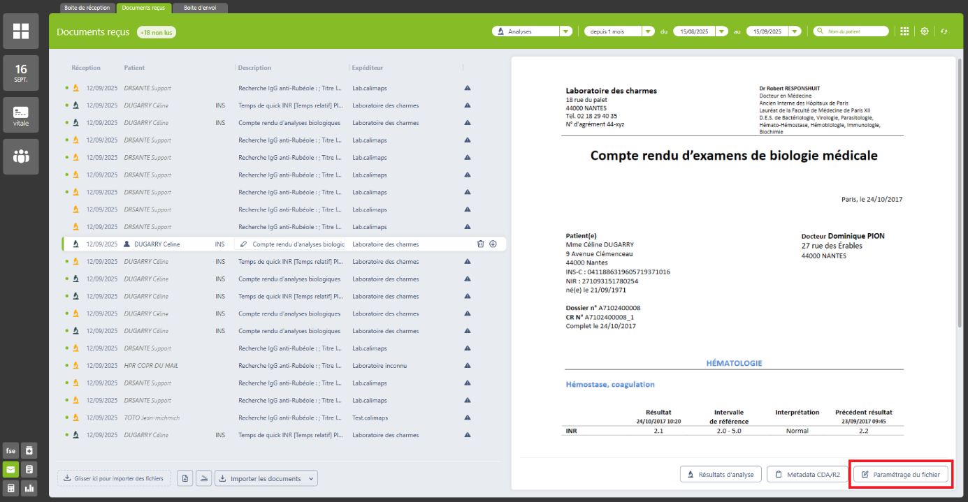 Les documents importés apparaissent dans le volet médical du patient, rubrique « Réception des analyses » pour les biologies au format .hpr et « Pièces jointes » pour les documents .pdf et autres.