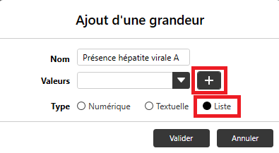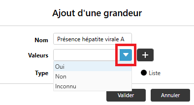 - Définissez le nom de chaque valeur attendue (ex. : Oui, Non, Inconnu) et cliquez sur Valider après chaque ajout.