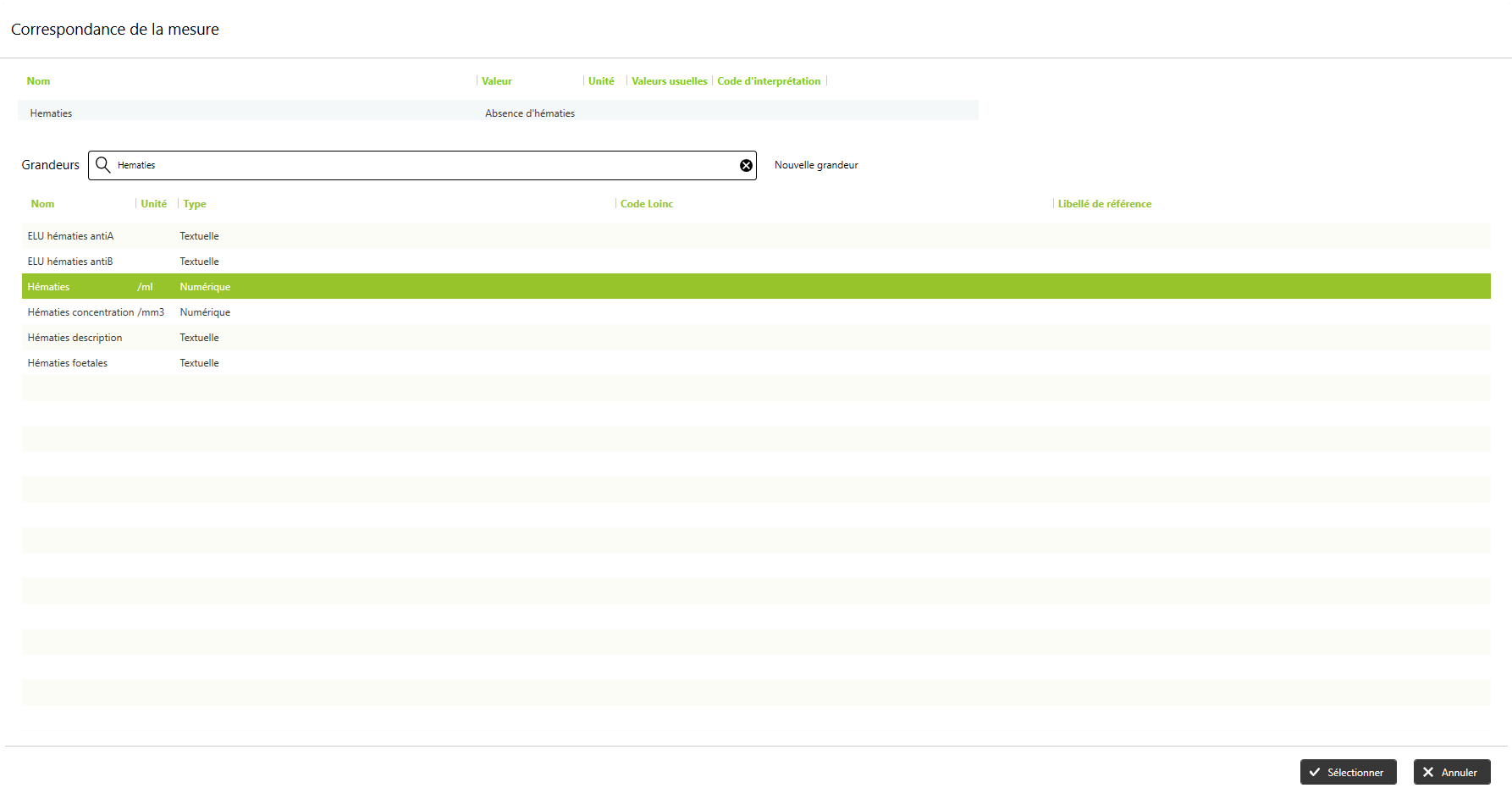 Correspondance existante : la mesure pourra être importée dans le dossier patient.