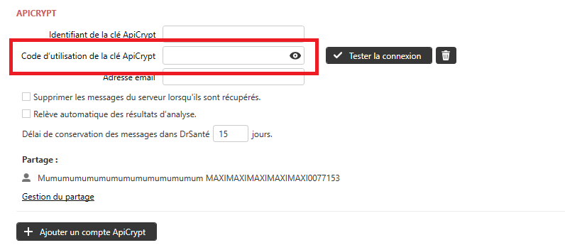4. Dans la section APICRYPT, cliquez sur + Ajouter un compte ApiCrypt : un formulaire s’affiche.