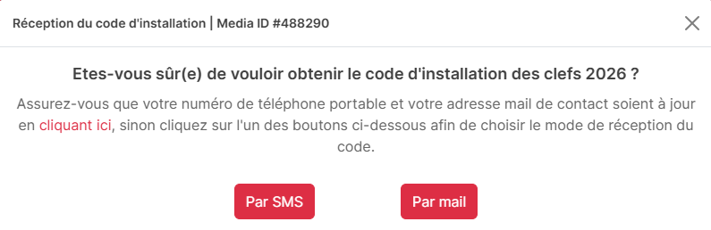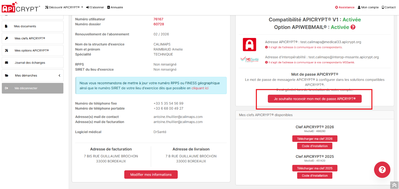 4. En bas de page, dans la section Mes clefs APICRYPT® disponibles, cliquez sur Code d’installation sous « Clef APICRYPT® 2025 » ou « Clef APICRYPT® 2026 » pour recevoir la clé par mail ou SMS.