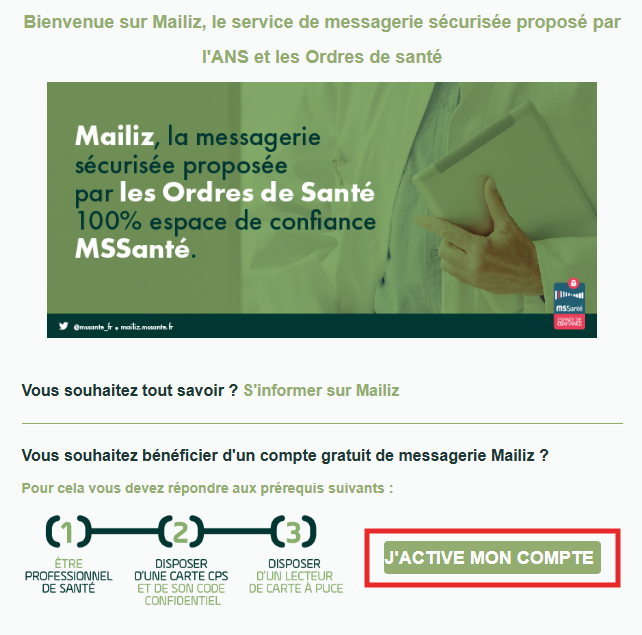 Premièrement, vous devez avoir créé votre adresse mail sécurisée Mailiz. Sur votre navigateur, rendez-vous à l’adresse suivante : https://mailiz.mssante.fr/