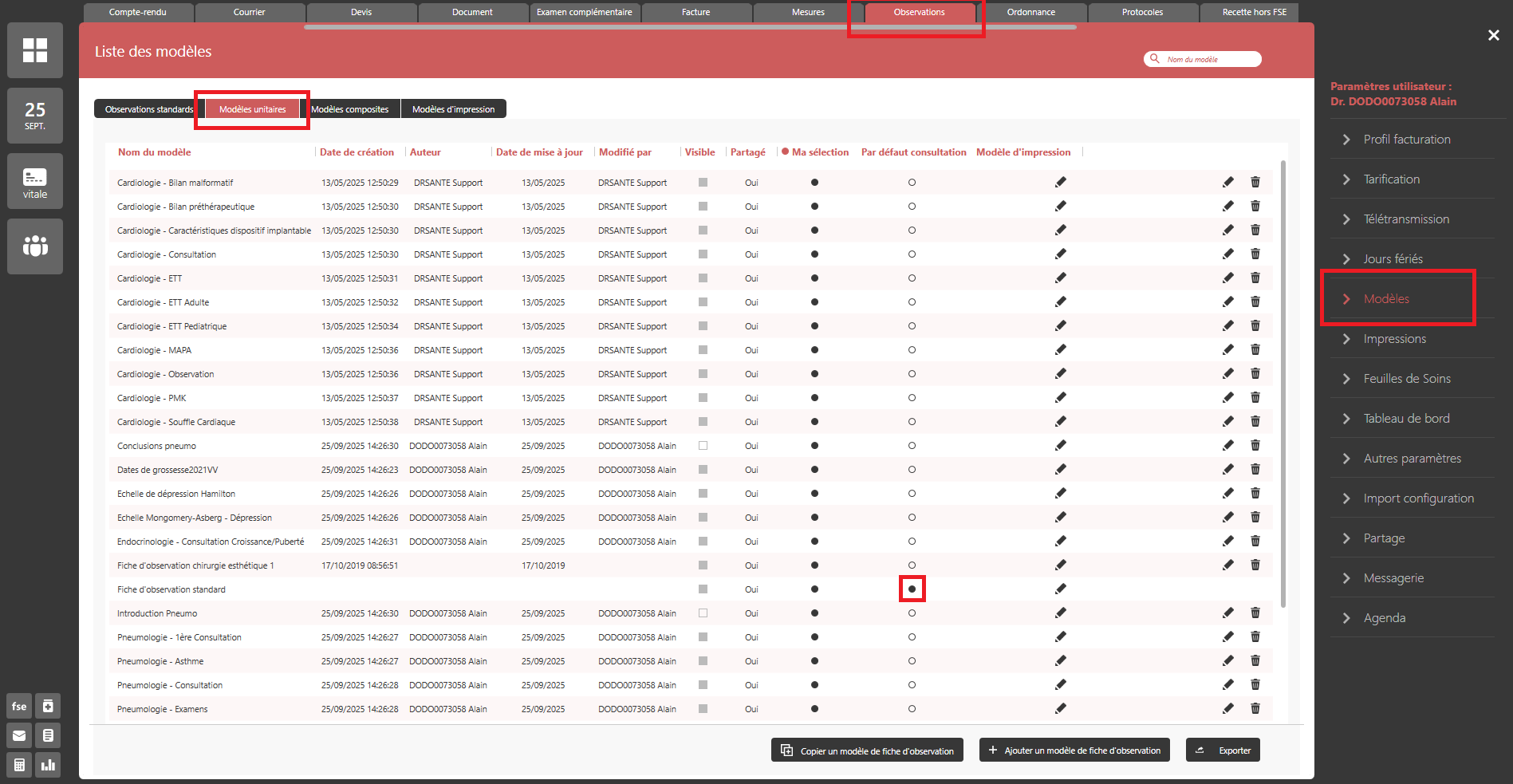 Une fois les fiches d’observation importées dans votre logiciel, vous pouvez définir celle que vous souhaitez utiliser par défaut lors de la création d’une consultation :