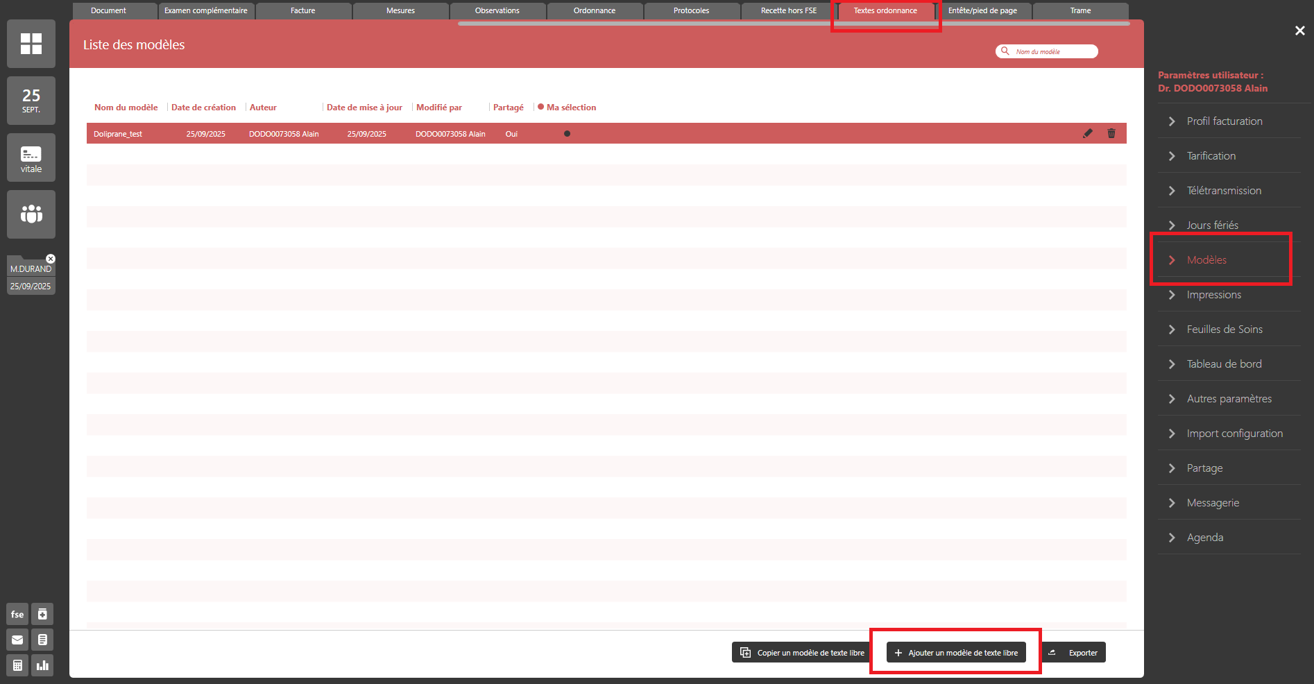 Paramètres > Utilisateur > Modèles > Textes Ordonnance - Cliquez sur « + Ajouter un modèle de texte libre ».