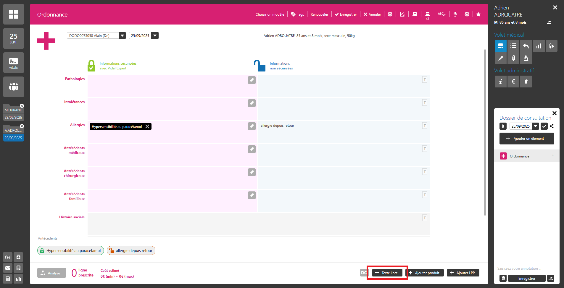 - Depuis le dossier de consultation, lors de l’ajout d’une ordonnance, cliquez sur « + Texte libre ».