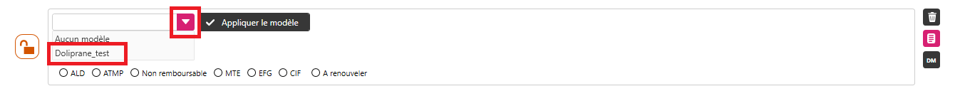 3. Cliquez sur « Appliquer le modèle » : le texte du modèle sera inséré dans l’encadré et fera partie de l’ordonnance.