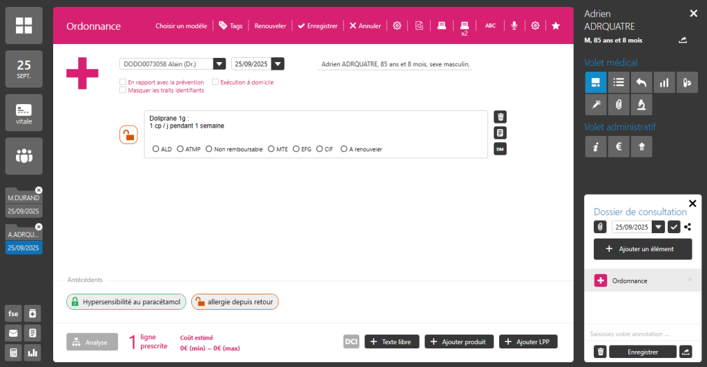 Il est recommandé d’avoir déjà suivi le tutoriel « Rédiger une ordonnance pas à pas » afin de savoir comment ajouter des produits et du texte à une ordonnance dans un dossier de consultation.