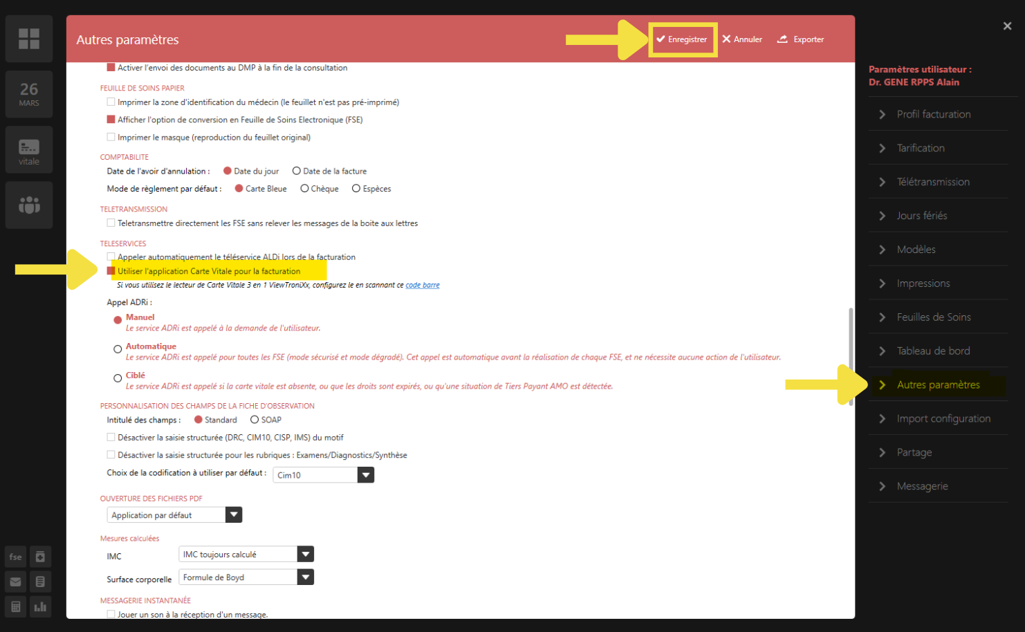 - Dans la section “Téléservices”, cochez la case : « Utiliser l’application Carte Vitale pour la facturation ».