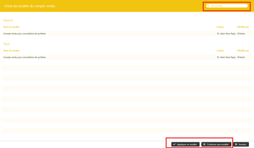 Si vous avez déjà créé des modèles de certificat médical, ils s’affichent automatiquement dans la liste.