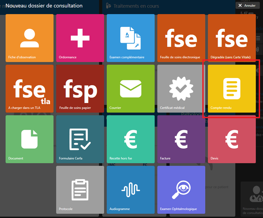 Depuis le dossier patient, cliquez sur l’icône « Nouveau dossier de consultation », située en bas à droite. Une liste d’éléments de consultation apparaît.