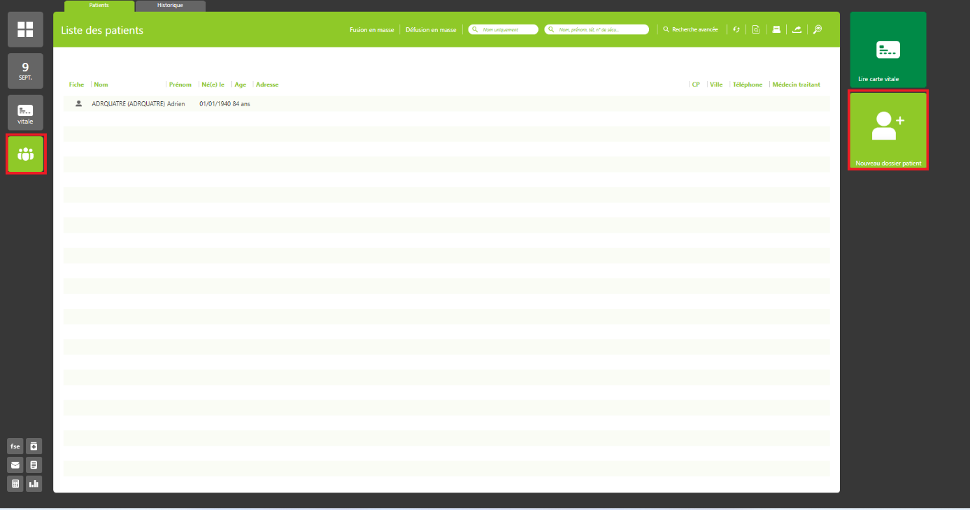 Si la carte Vitale est absente, cliquer sur l’icône « Vitale » de la barre latérale gauche puis sur « Nouveau dossier patient ».