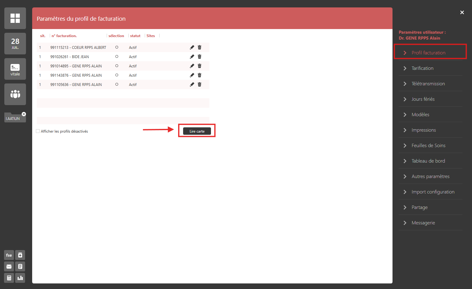 Depuis la page d’accueil, cliquez sur l’icône ⚙️ (roue crantée), puis allez dans le menu « Profil facturation ». - Cliquez sur « Lire Carte »