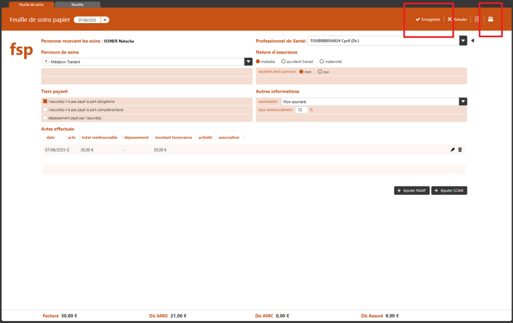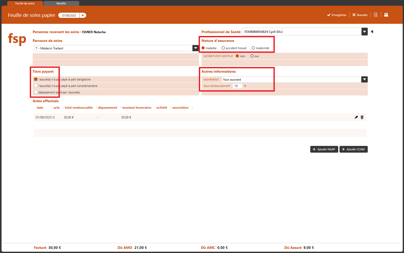 Si un modèle de Feuille de Soins a été utilisé, les différents champs seront déjà préremplis. Sinon selon la situation, les sélectionner depuis les sections :