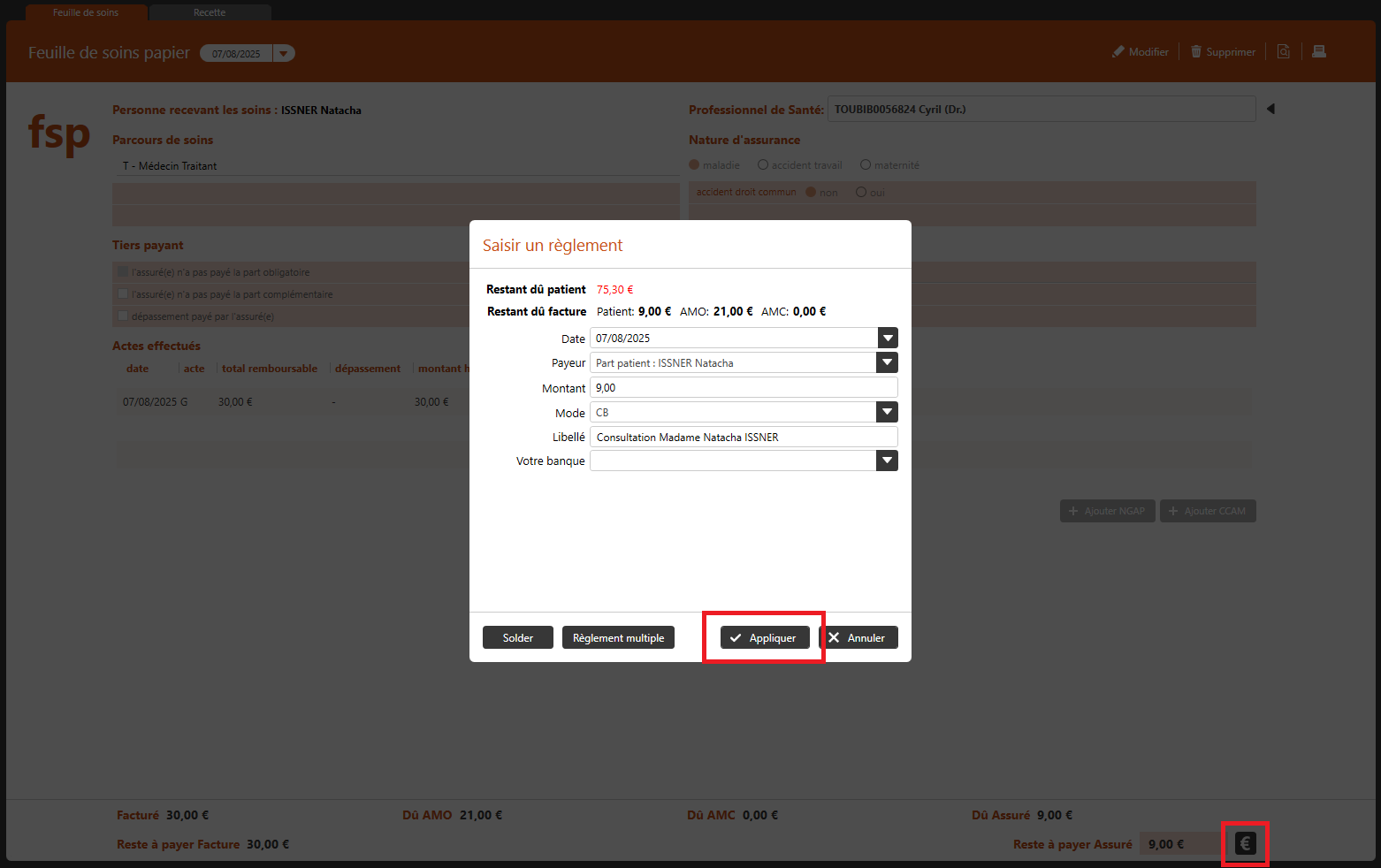 Après l’enregistrement, cliquez sur le bouton € pour indiquer le mode de règlement. Sans cette étape, la facture restera en impayé dans la comptabilité.