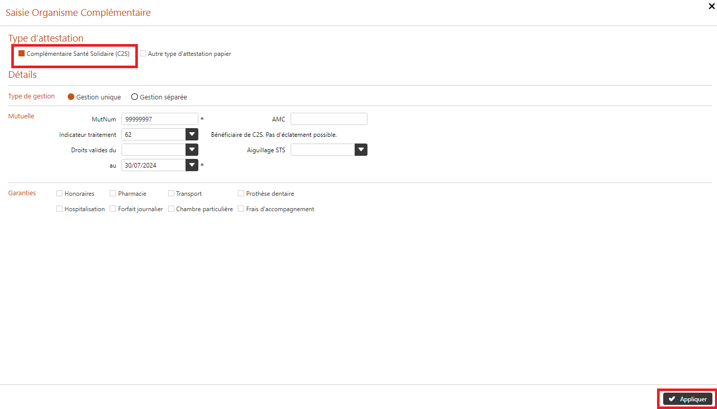 Lors de la création d’une Feuille de Soins Électronique avec Carte Vitale, si les droits C2S est renseignée sur la carte, DrSanté propose automatiquement d’appliquer le tiers payant intégral.