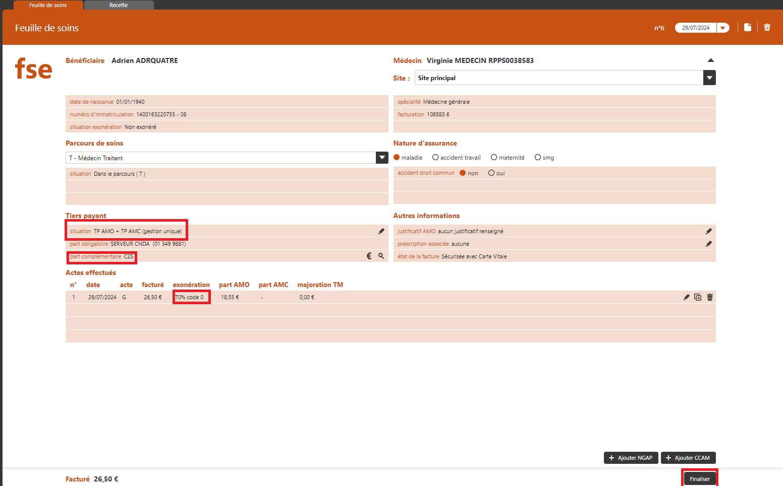 Le tiers payant s’active automatiquement. La mention « C2S » apparaît dans la fiche de facturation.