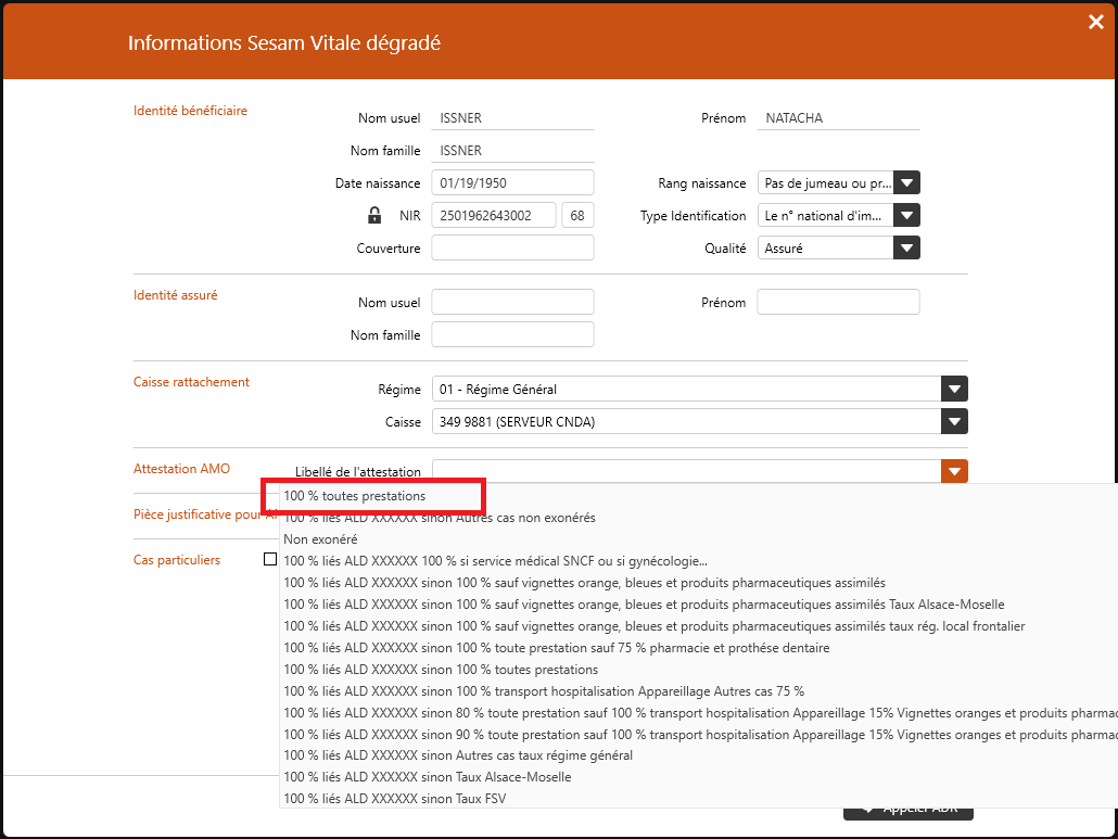Toutefois, s’il faut sélectionner manuellement le taux, il convient de choisir l’attestation suivante dans la liste proposée : Attestation AMO > Libellé de l’attestation > 100% toutes prestations