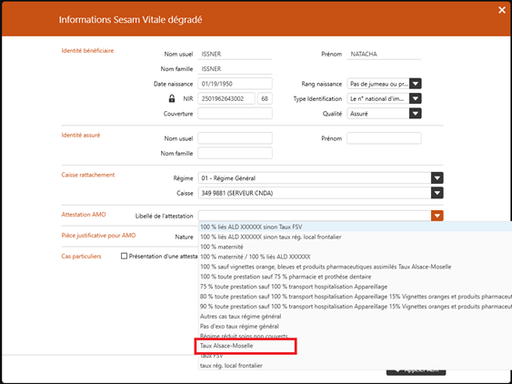 Toutefois, s’il faut sélectionner manuellement un taux, il convient de choisir l’attestation suivante dans la liste proposée : Attestation AMO > Libellé de l’attestation > Taux Alsace-Moselle.