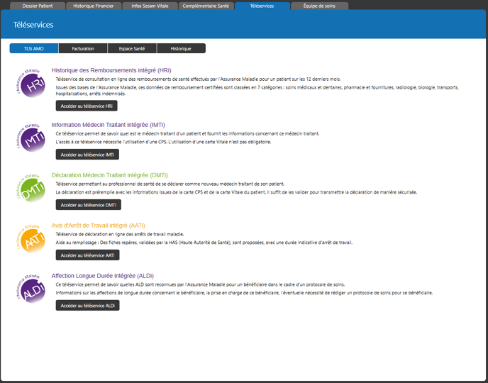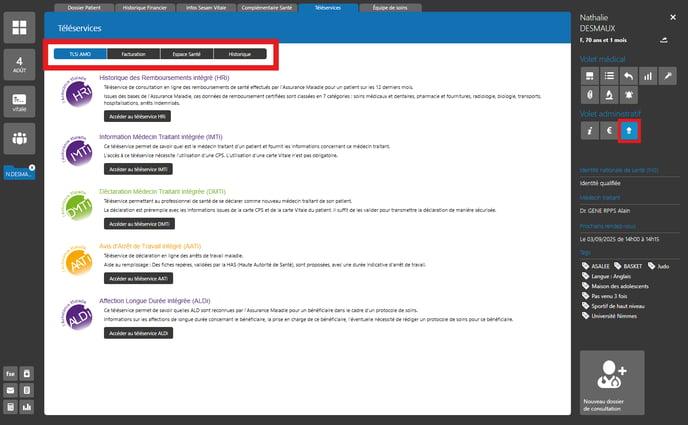 DrSanté intègre de nombreux téléservices officiels, accessibles depuis le volet administratif du dossier patient. Ce volet est séparé en 4 grandes catégories :
