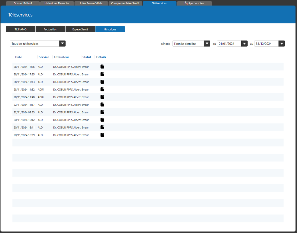 Cette section permet de retrouver la liste de tous les téléservices utilisés pour un patient donné, avec une mention claire du type de service, date d’appel et utilisateur initiateur.