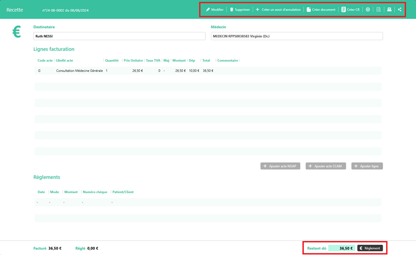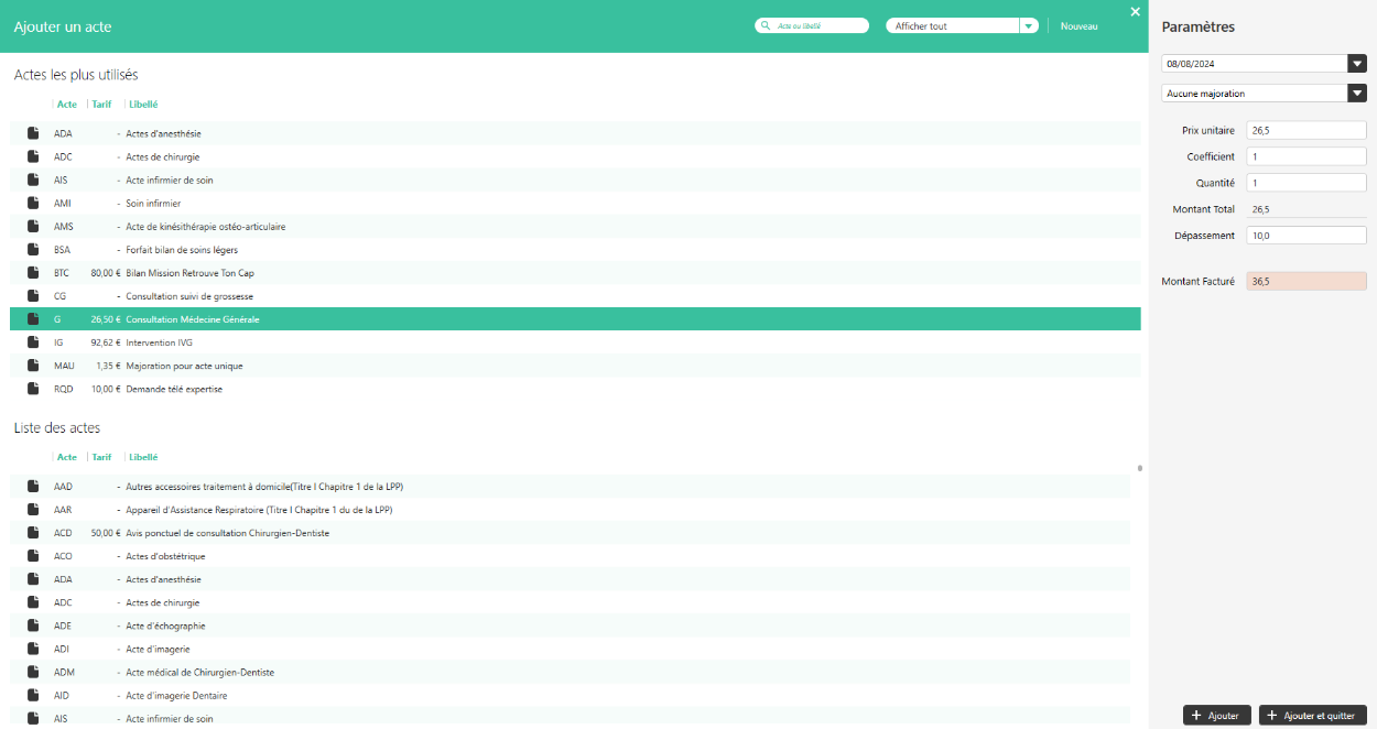 Ne pas modifier le prix unitaire d’un acte, celui-ci correspond au tarif conventionné de la CPAM. Concernant les dépassements d’acte, se renseigner au préalable en fonction de votre secteur de conventionnement.