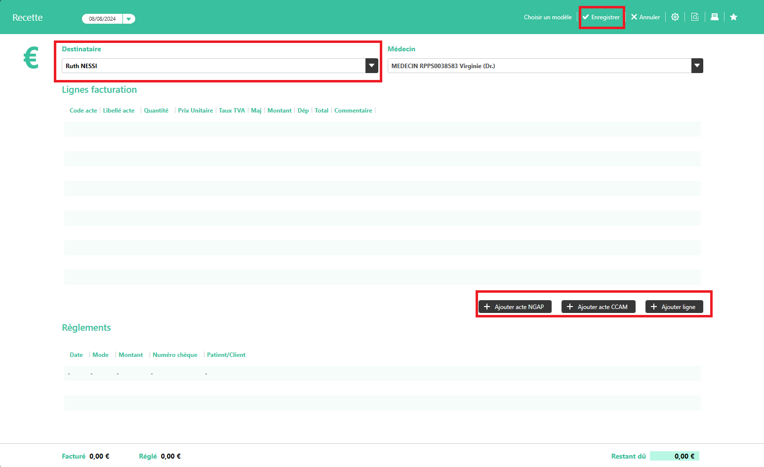 - Définir le destinataire et le médecin de la recette.
