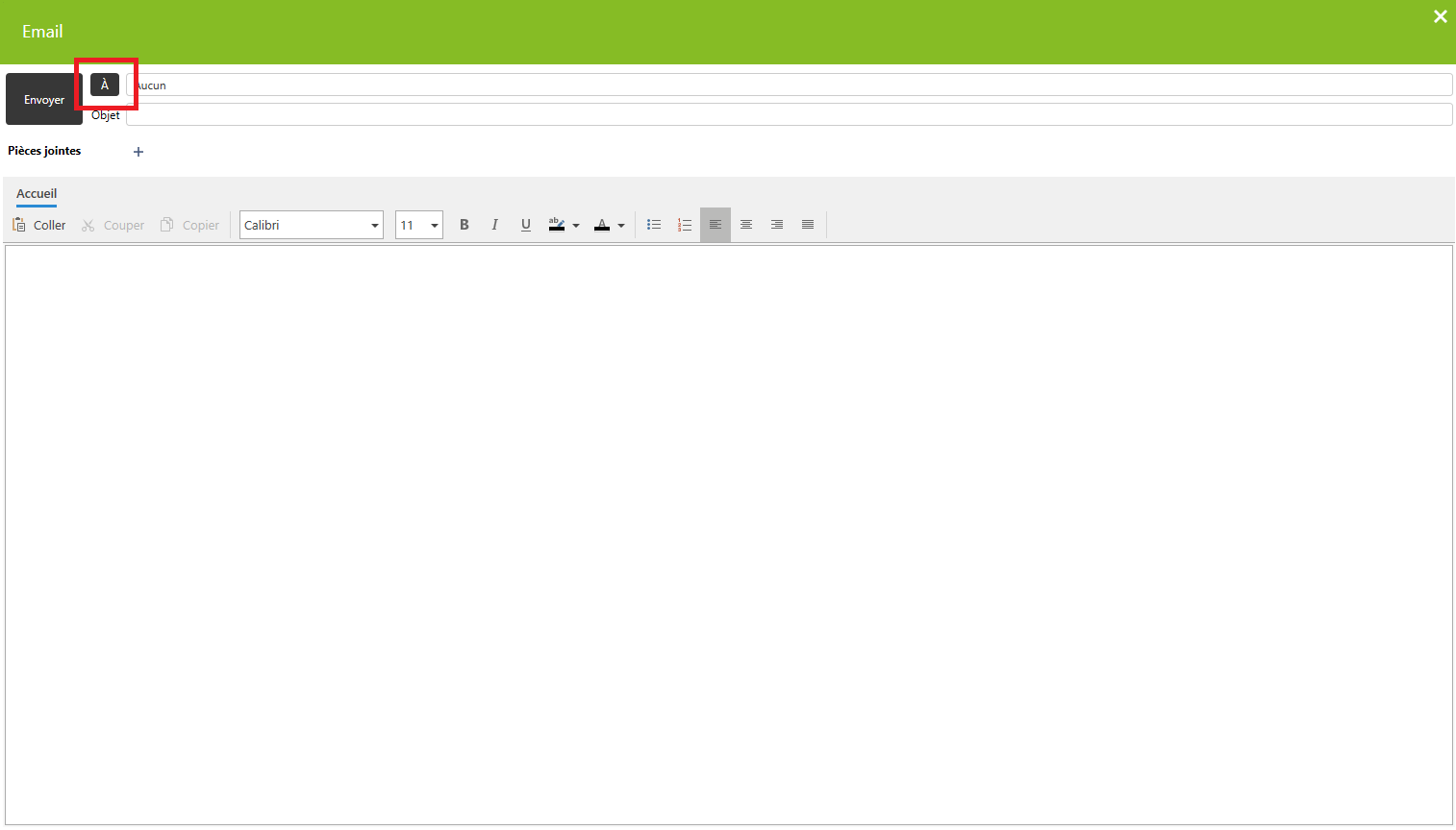 - Rédigez le contenu du mail, visualisez les documents joints, puis choisissez le ou les destinataires via le bouton « À ».
