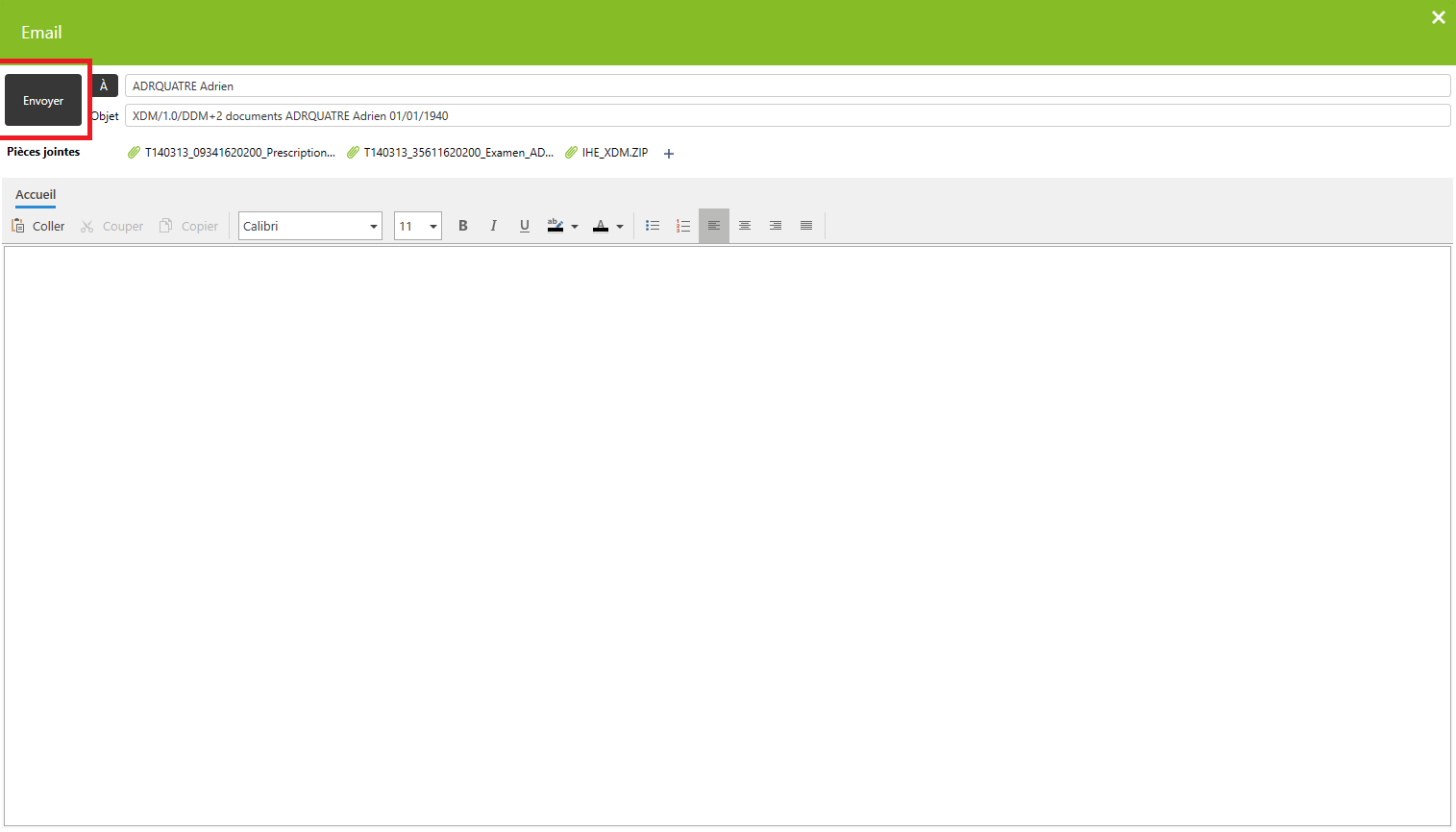 - Pour un mail depuis la boîte de réception ou l’export de consultation : cliquez sur « Envoyer » en haut à gauche.