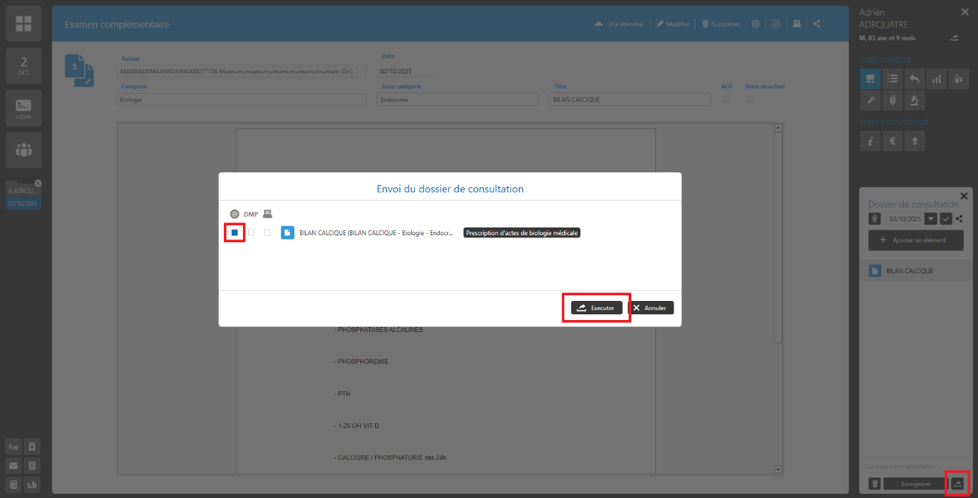 - À la fin d’une consultation, cliquez sur le bouton “ Exporter” en bas à droite du dossier de consultation.