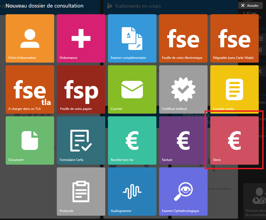 Depuis le dossier patient, cliquez sur l’icône « Nouveau dossier de consultation », située en bas à droite.