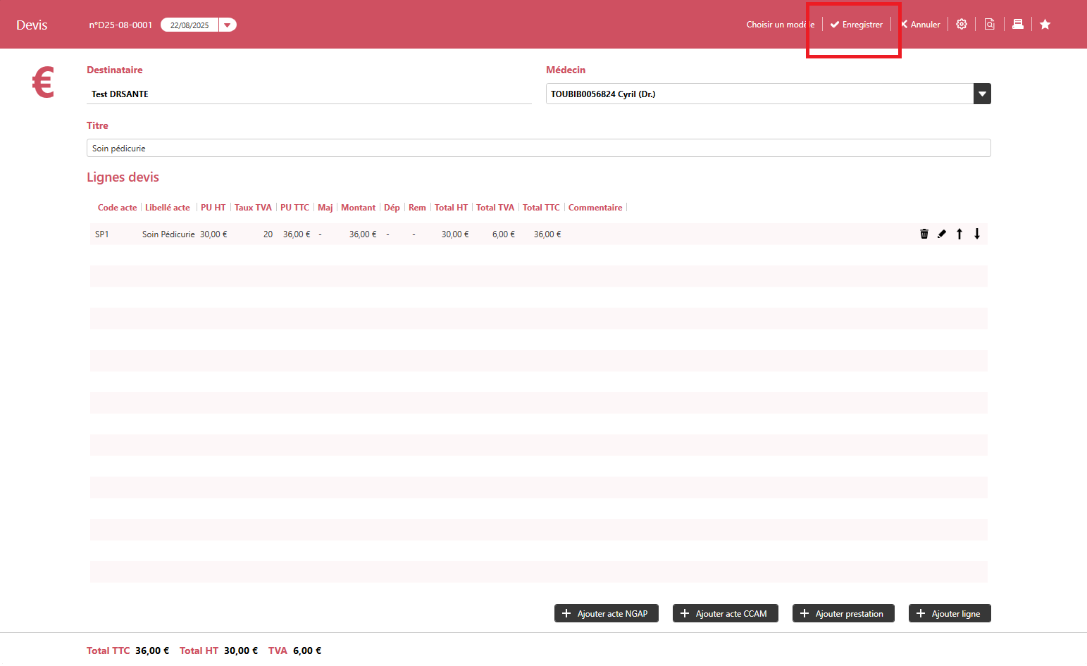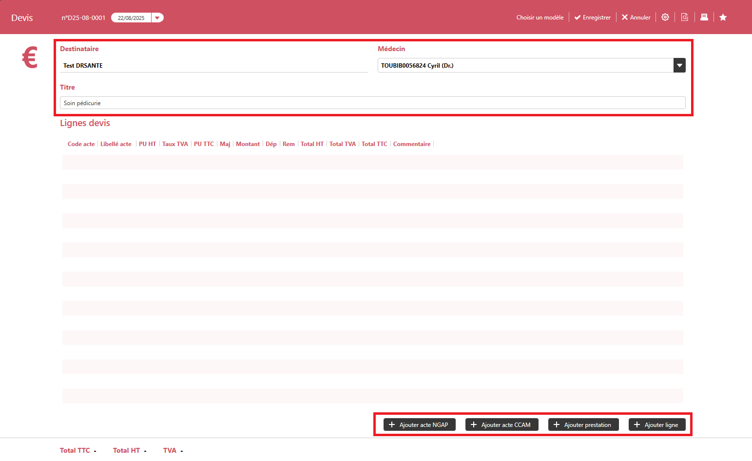Ne pas modifier le prix unitaire d’un acte, celui-ci correspond au tarif conventionné de la CPAM. Concernant les dépassements d’acte, se renseigner au préalable en fonction de votre secteur de conventionnement.