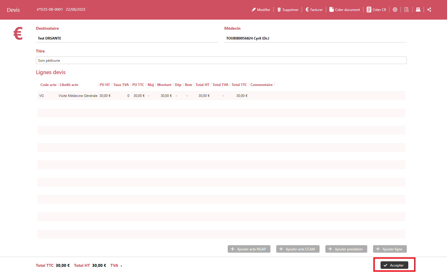 Le devis complété, il est possible de préciser si celui-ci est accepté en cliquant sur le bouton « Accepter » situé en bas à droite