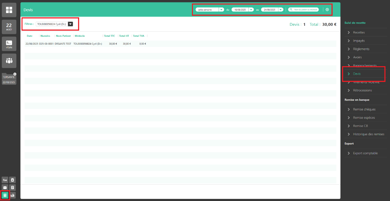 Il sera possible de filtrer la liste par date, par nom praticien, nom patient ou par montant.