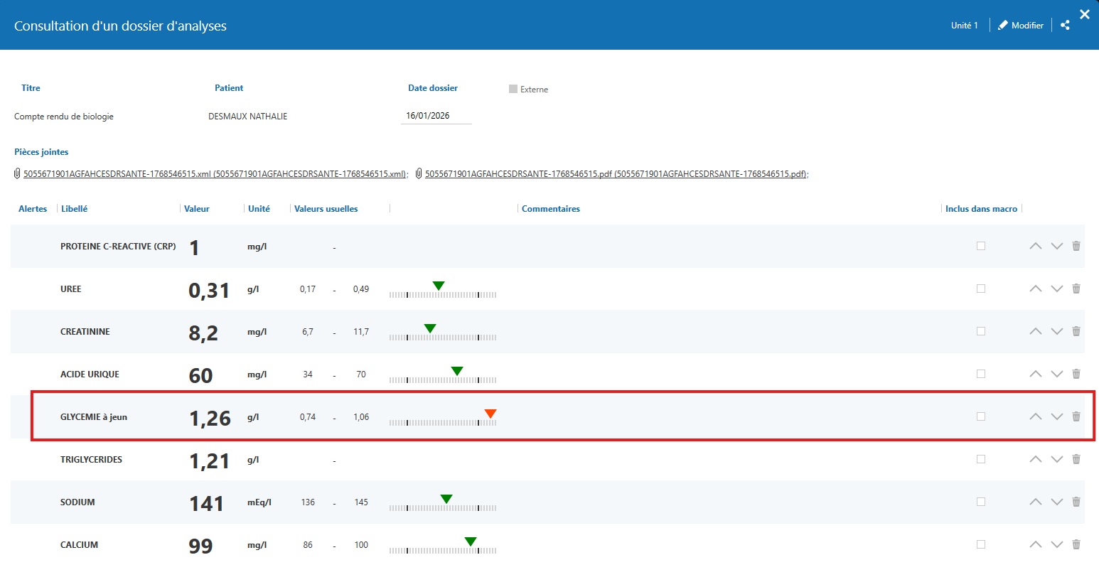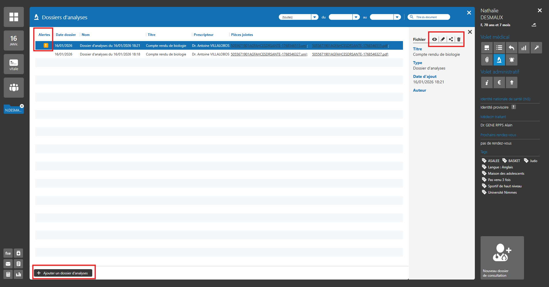 Toutes les analyses importées depuis la Réception d’analyses sont automatiquement classées dans cette section du dossier patient.