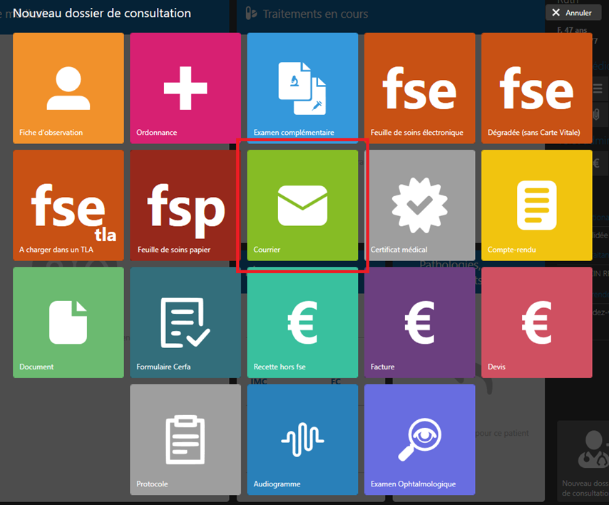 Depuis le dossier patient, cliquez sur l’icône « Nouveau dossier de consultation », située en bas à droite.