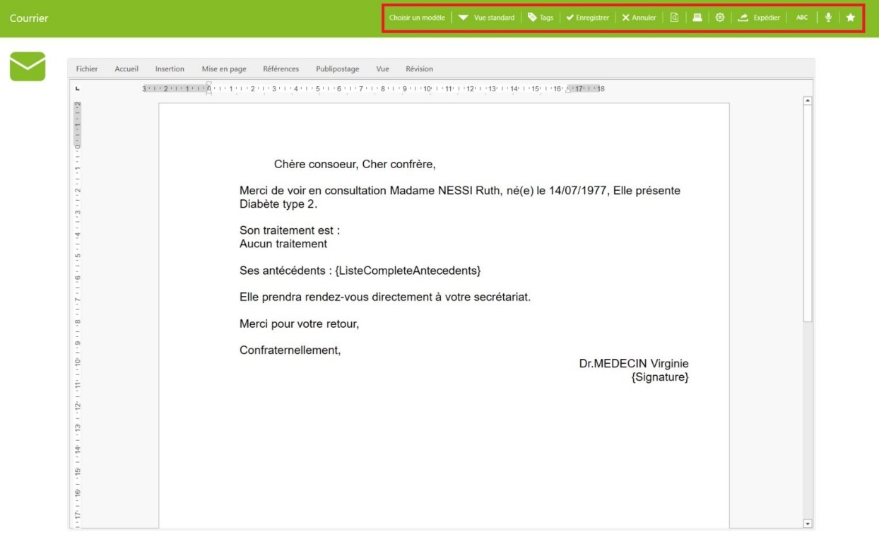 Une fois le courrier finalisé, plusieurs options sont disponibles en haut de l’écran.