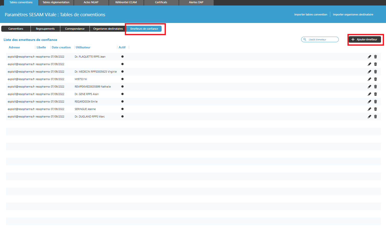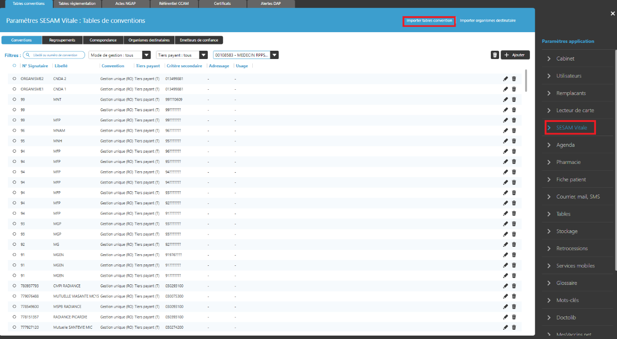 Toujours dans les « paramètres applications » > « Sesam Vitale » > Onglet « Tables conventions ».