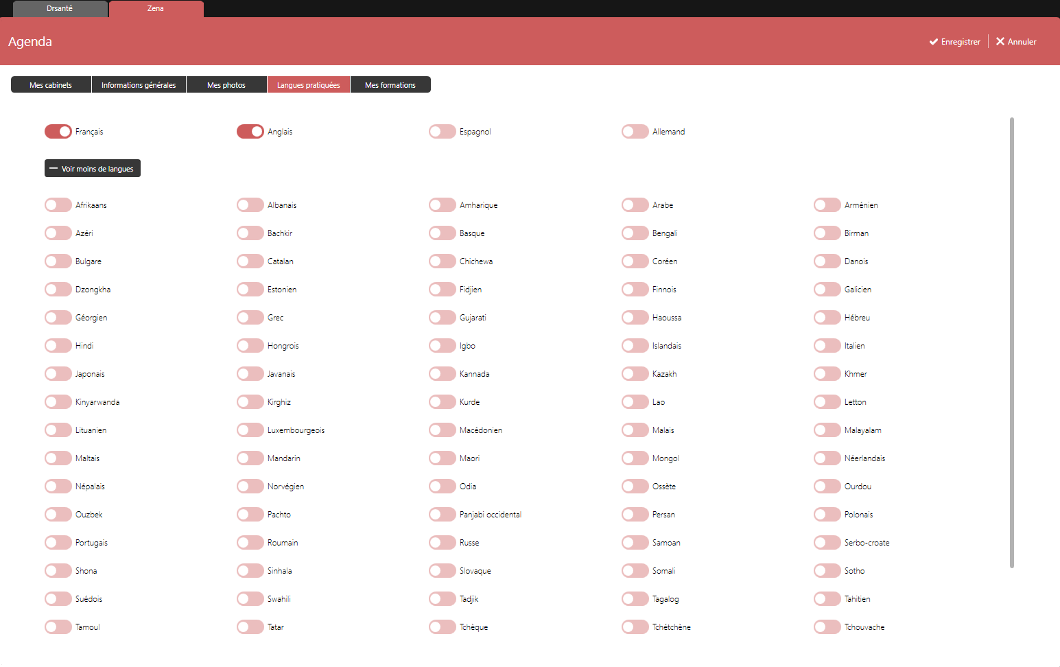 Activez ou désactivez les langues parlées. Vous pouvez ajouter d’autres langues en cliquants sur le bouton « + Voir plus de langues »