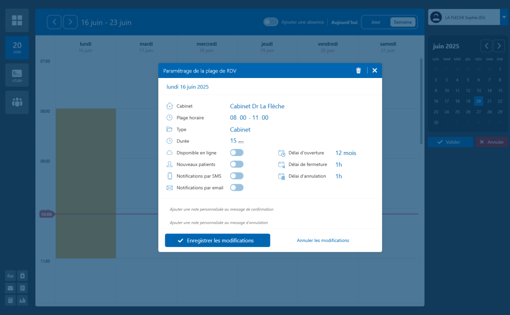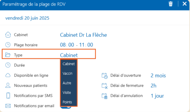 • Définir les paramètres du créneau : Horaire, Type de rendez‑vous (ex. : cabinet, visite), Durée
