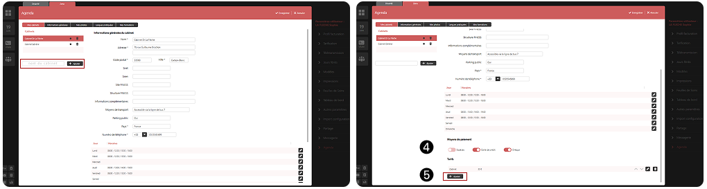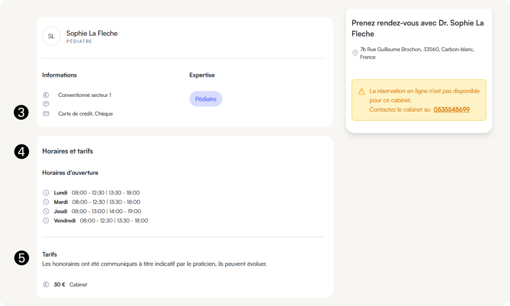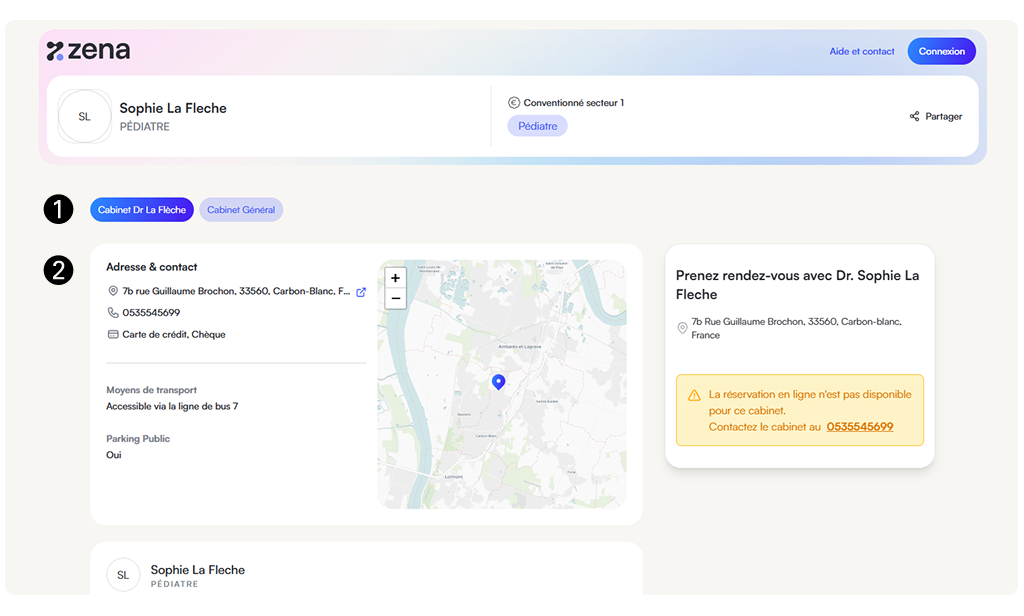 ➊ Ajoutez un cabinet. Sélectionnez le cabinet pour le rendre visible sur votre profil en ligne