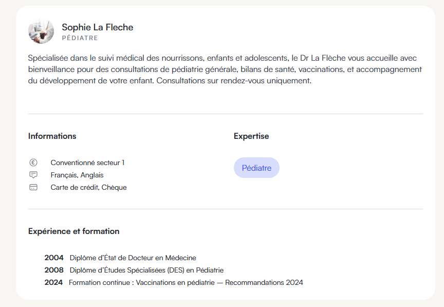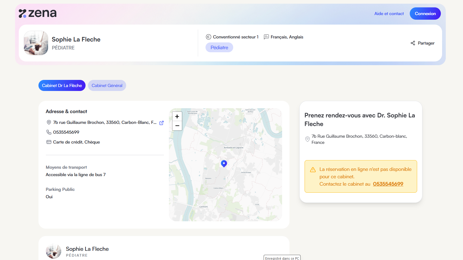 Une fois le paramétrage effectué, vous pouvez consulter votre profil en ligne Zena. Ce dernier se met à jour instantanément dès qu’une modification est enregistrée sur DrSanté.