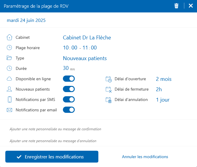 • Délai d’annulation : délai limite pour qu’un patient puisse annuler seul. Ex. : 24 h ⇒ le patient doit annuler au moins un jour avant. Sinon, il doit appeler le praticien.