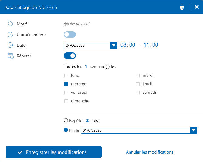 Pour rappel : Le paramétrage effectué pour un jour (ex. mercredi) sera automatiquement appliqué à tous les mercredis. Il est possible de paramétrer ponctuellement ou de manière régulière une absence pour déroger à cette règle récurrente (cf. Section «Paramétrage des absences» ci-après).