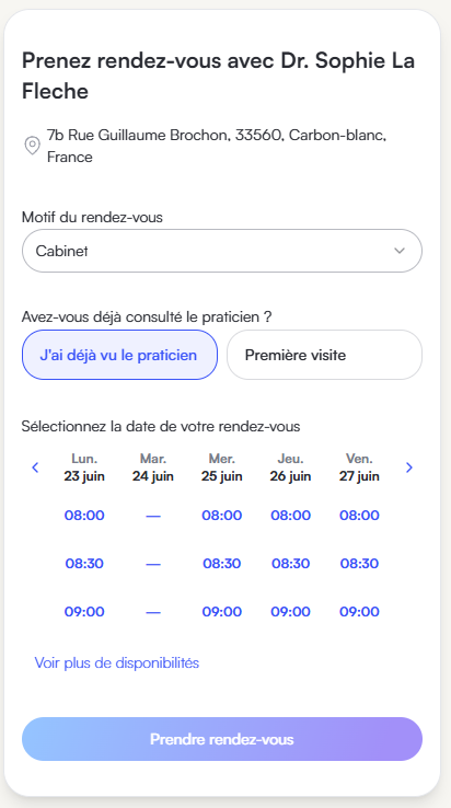 Côté patient, la prise de rendez-vous est rapide, disponible 24h/24 et 7j/7, avec un envoi sécurisé des documents et des rappels automatiques pour éviter les oublis.