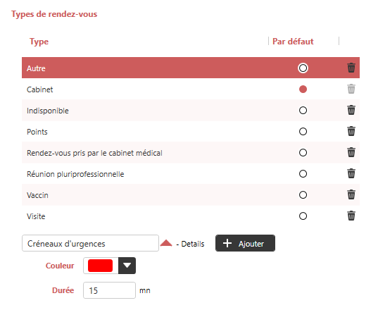 Vous pouvez créer autant de types de rendez-vous que nécessaire, selon vos besoins (consultation classique,