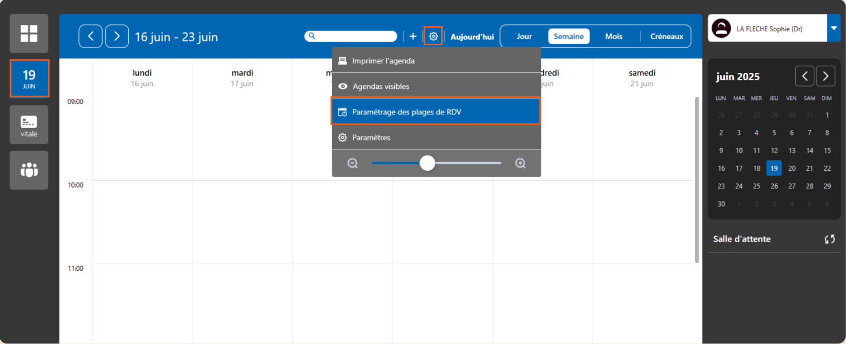en haut à droite de l’agenda pour accéder aux paramètres. Sélectionnez « Paramétrage des plages de RDV » dans le menu déroulant.