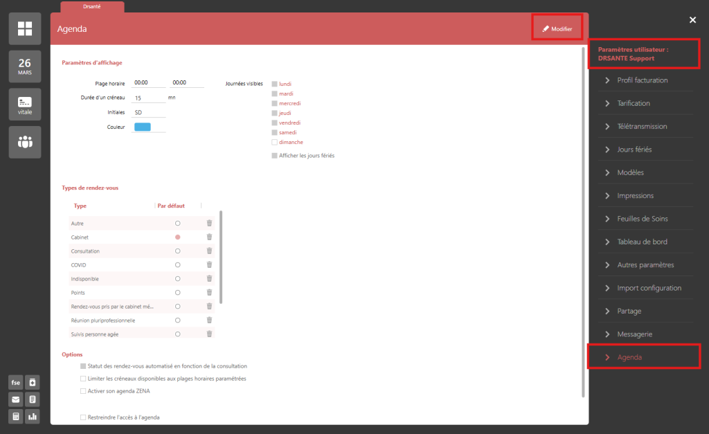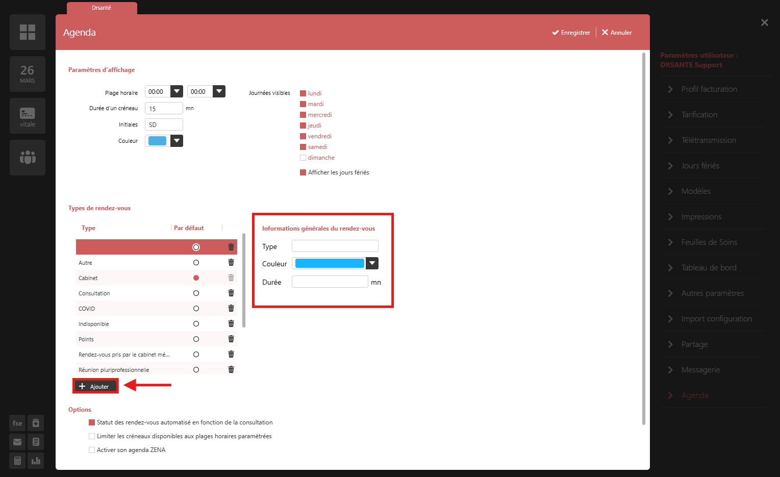 - Identifiez votre agenda : utilisez-vous l’agenda classique DrSanté ou la prise de rendez-vous en ligne Zena ? Les options de création diffèrent selon le mode.
