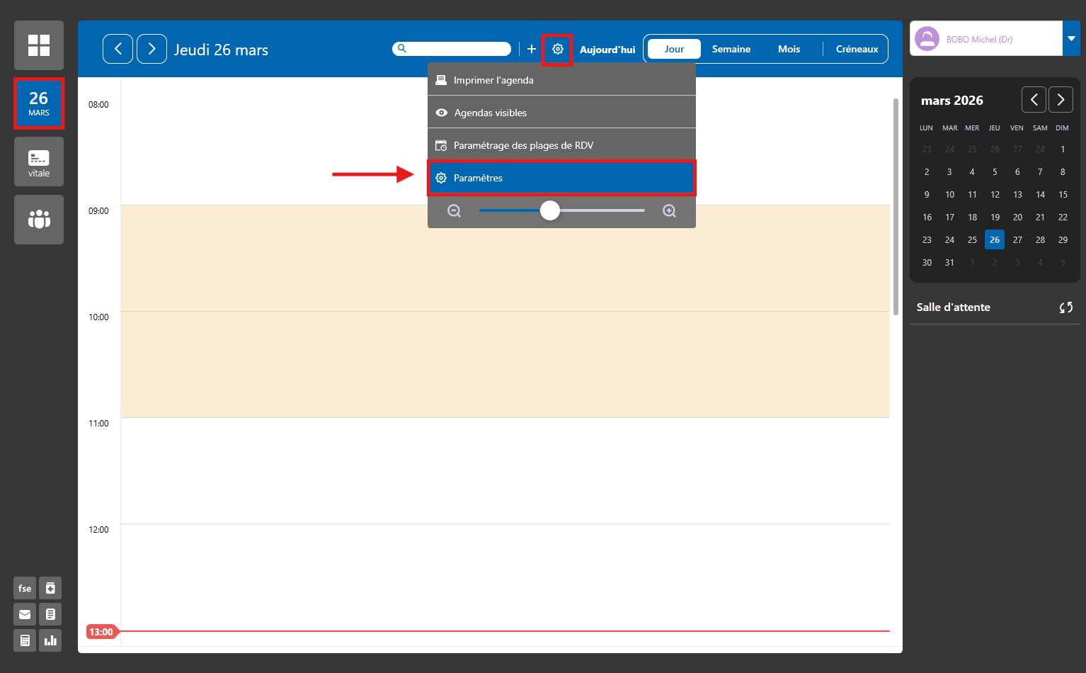 - Depuis l’agenda : cliquez sur la roue crantée, puis sur Paramètres.