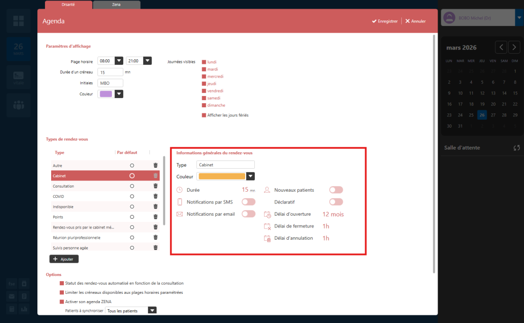 - Mode Avancé (DrSanté + Zena) : En plus des champs standards, vous accédez aux paramètres de prise de rendez-vous en ligne :